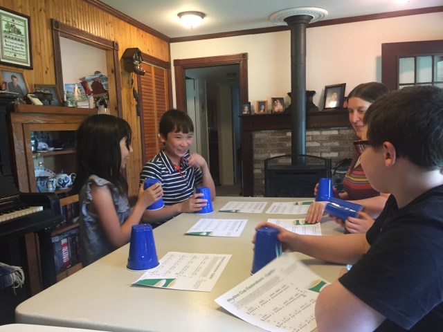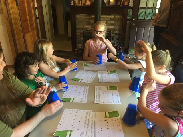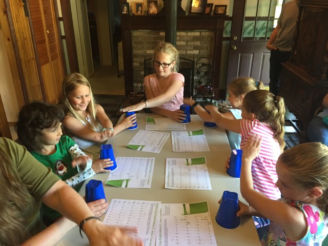 The next activity that’s new to our studio is called “Rhythm Cups”. We gave our students a couple pages of rhythms to learn ahead of the actual Piano Parties, with cup-tapping and other motions to do in those rhythms. Even though they were learned individually before the class, it was an added challenge at the class to coordinate all these motions including passing cups to each other, and staying right with the music! It requires everyone to concentrate fully on their rhythm and coordination, which is essential for all musicians. And it’s nice to work on such an important skill in such a fun way!