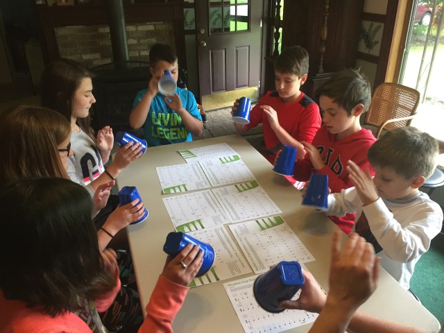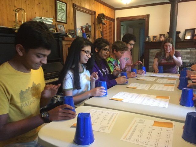 The next activity that’s new to our studio is called “Rhythm Cups”. We gave our students a couple pages of rhythms to learn ahead of the actual Piano Parties, with cup-tapping and other motions to do in those rhythms. Even though they were learned individually before the class, it was an added challenge at the class to coordinate all these motions including passing cups to each other, and staying right with the music! It requires everyone to concentrate fully on their rhythm and coordination, which is essential for all musicians. And it’s nice to work on such an important skill in such a fun way!